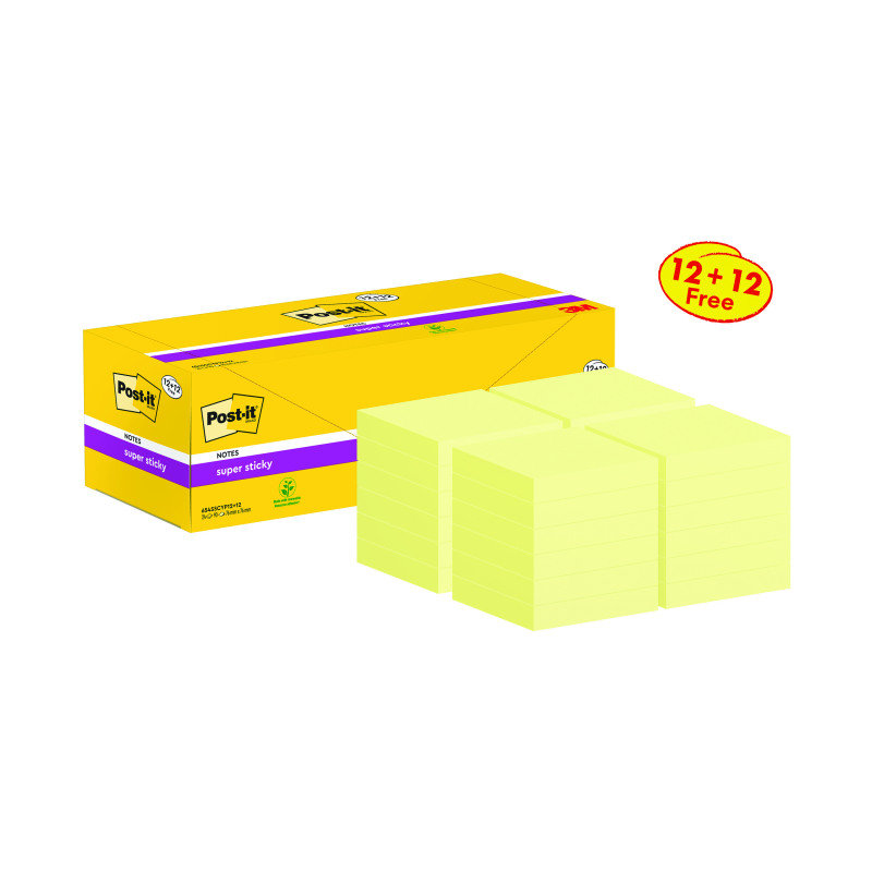 Post-it Super Sticky Notes Value Pack 76 mm x 76 mm 12 pads + 12 FREE Canary Yellow (Pack 24) - 7100290162