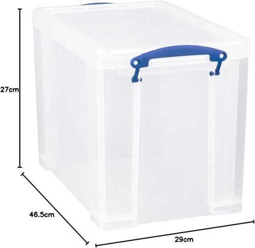 This Really Useful storage box is suitable for foolscap suspension files for handy filing and storage in the office or at home. The box is made from durable polypropylene with a separate lid and integrated carry handles. Stackable and stable, this clear storage box has a 24 litre capacity and measures W465 x D270 x H290mm.